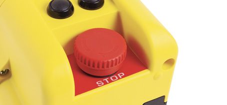 Der pilzförmigen Not-Halt-Schalter gewährleistet einen maximalen Grad an Sicherheit, gemäß den europäischen und internationalen Normen. Obwohl der Not-Halt Schalter optimal gegen versehentliche Stöße geschützt ist, ist er für den Bediener leicht erreichbar und nimmt eine Vorrangstellung ein.