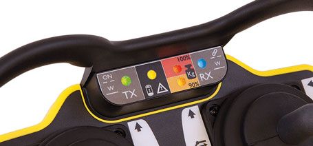 Die LEDs an dem Sender zeigen den Betriebszustand, Akku-Leermeldung und Störmeldungen der Funkfernsteuerung an. Weitere LEDs können als Rückmeldung, um Zustände der Maschine anzuzeigen, vorgesehen werden.