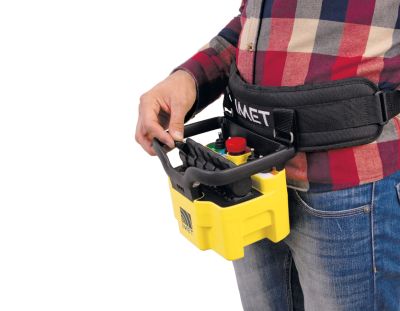 Der Standardlieferumfang kann durch einen hochwertigen Bauchgurt erweitert werden. Damit hat der Sender einen praktischen Sitz und hängt bei der Arbeit nicht im Weg.