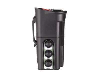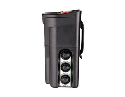 Das Gehäuse des Senders ist mit einem stabilem Gürtelclip ausgestattet. Dadurch lässt sich der handliche Sender am Gürtel komfortabel tragen und man hat beide Hände frei.